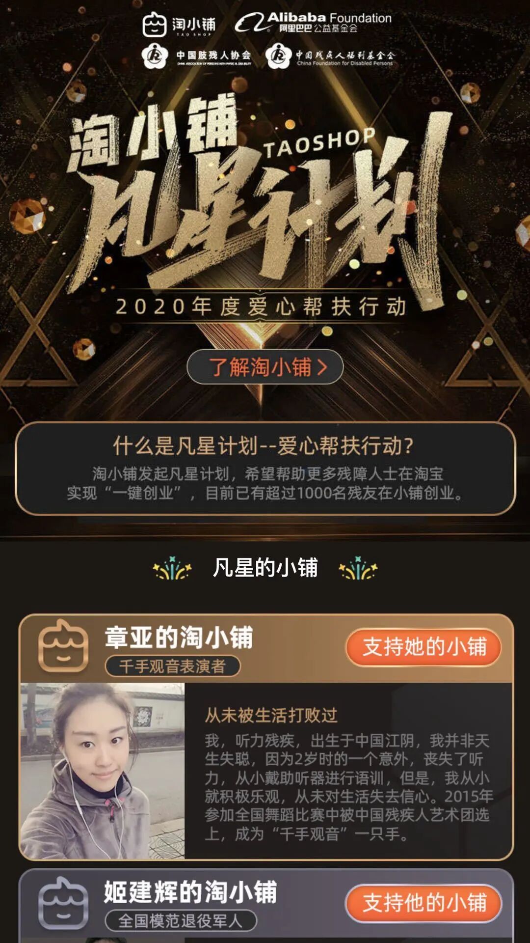 “从不知道淘小铺是什么,到此次在直播中与主播连麦进行卖货,让我收获良多。”说话的是参与了此次连麦推广活动的残疾人掌柜章亚,她是一名中国残疾人艺术团退役的舞者,也是集善乐业·凡星计划项目的首批受益人。“在此次的活动中,因为我没有适合的设备可以进行连麦,活动一度陷入困境。中国残疾人福利基金会集善乐业项目办公室在知道后,紧急与当地志愿者进行沟通协调,志愿者赶了30公里的路为我送来设备。淘小铺那边的主播团队在得知我听力障碍后,不仅耐心通过文字与我做脚本沟通,还贴心的为我准备了手语老师,在直播中搭起我与观众沟通的桥梁。他们这一点一滴的付出与努力,让我铭记于心,让我觉得创业的路也没有那么难。”